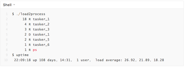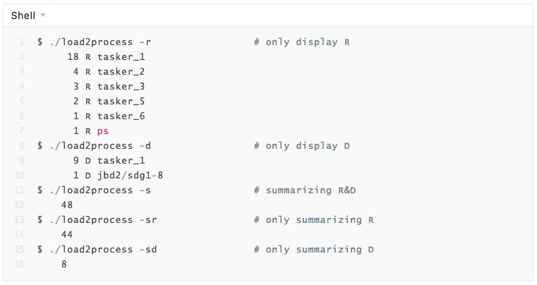 load2process输出结果中第一列之和、load5s和load1值之间的关系也一目了然。load2process第一列之和是运行这个脚本的瞬时nr_running和nr_uninterruptible状态线程数之和。load5s值是每5001毫秒对nr_running和nr_uninterruptible状态线程数之和的一个采样。load1是对之前历史所有load5s采样值按某种算法的平均值。
