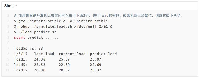 load5s除了比load1更加灵敏这个用途之外,它也是能帮我们揭示load1、load5和load15的计算逻辑的最关键因素。我们可以尝试在安装了load5s模块的机器上,运行如下load_predict.sh的shell脚本。