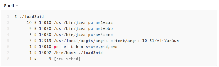 如果在执行 ./load2process 后,结果中的第三列比较集中于java、python和php等进程名。则可以继续使用load2pid工具进行进一步load分解。效果如下: