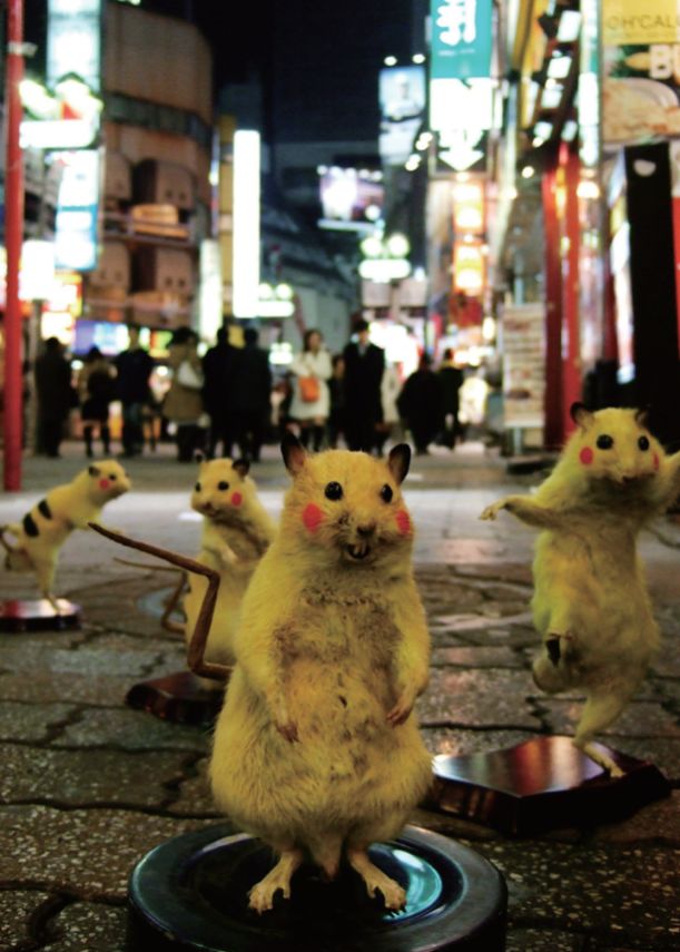 年轻艺术家团体Chim↑Pom 共6名成员,出生于20世纪70~80年代,2005年开始正式出现在公众视野。与他们「艺术团体」的标签不相符的是,团队里只有唯一的女性成员Ellie是接受过正规美术教育的。队长卯城龙太高中退学后在酒馆门口揽客,同时也是徒步旅行的背包客。他与副队长林靖高在高中结识,两人原本一直在做朋克乐队,因为对「朋克」的意义过度思考,徒有「乐队」之名却根本没有音乐作品。这样的奇怪状况让他们发现自己对旋律或节奏并没任何执着,比起「音乐」本身,「有趣」才是一切的出发点。于是两人很自然地转向表现形式更为丰富自由的艺术领域。在诸多现代美术家之中,遇到了会田诚的《孤独行星》(孤独な惑星 Lonely Planet)。被成员认为「最有艺术头脑,同时也最浑蛋」的冈田将孝,原本是在九州的大学念书的普通大学生,在无聊的校园生活中发现了会田诚的作品,为了摆脱枯燥的日常,怀抱着「(会田诚)这种艺术我大概也行」的错觉,以「考入会田诚执教的美术学校」这种冠冕堂皇的理由退学,离开九州来到东京。担当团内造型设计的稻冈求,曾为考入东京艺术大学当了3年「浪人」,结果仍未能如愿。原本是喜好中世纪古典绘画的艺术青年,也是从会田诚开始对现代美术产生兴趣。水野俊纪来到东京的理由更为简单:艺术或者随便其他什么都好,只想离开老家岐阜,来这里「玩些大的」。会田诚表示身边有个「有些黑色幽默的怪家伙」,把他带到了Chim↑Pom的团队中。团队内唯一的女性成员Ellie,原本在「大小姐学校」上学,从打扮也很容易辨识出,是经常在涩谷一带游玩的「gal 系」女孩。高中时作为课程的一部分,参加了横滨三年展现代美术国际展览。展览上Ellie 遇到了会田诚的作品,一时惊为天人。虽然外表是「gal」,内心却是喜欢太宰治、三岛由纪夫、坂口安吾的文学少女。Ellie 心中,会田诚的影像逐渐与这些文豪重合,以至于后来经常参加会田诚的座谈会,并成为他绘画的模特。