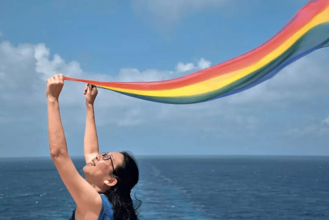那天早上不到5点,母子俩跑上甲板。茫茫大海上,只有这一艘船。甲板上零星几个人。旁边一对同志情侣紧紧拥抱在了一起。谁也没有说话。儿子举起一条细细的彩虹绸带,绸带迎着海风飘扬。妈妈面容沉静,目视远方,手攀上儿子的肩膀,轻轻地,缓慢地拍着。她感到幸福。太阳还躲在云后,天正慢慢亮起来。