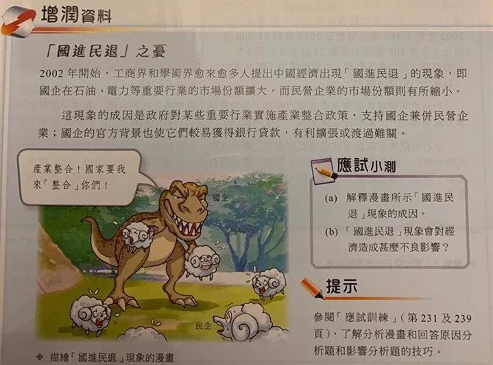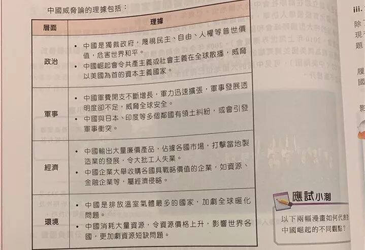 2、把中国威胁论的西方逻辑直接搬到教材里边。在政治威胁项中,称中国是独裁政府,蔑视民主、自由、人权等普世价值,危害世界和平。中国崛起会令共产主义或社会主义在全球散播,威胁以美国为首的资本主义国家。在军事威胁项中,称中国军费开支不断增长,军力迅速扩张,军事发展透明度不足,威胁全球安全。在经济威胁项中,则称中国输出大量廉价产品,占领各国市场,打击当地制造业,令大批工人失业;还说中国收购其他国家的企业,属经济侵略。在环境领域,则说中国是全球排放最多的国家,加剧全球暖化;称中国消耗大量资源,使得资源价格上涨,影响世界各国,加剧资源短缺问题。