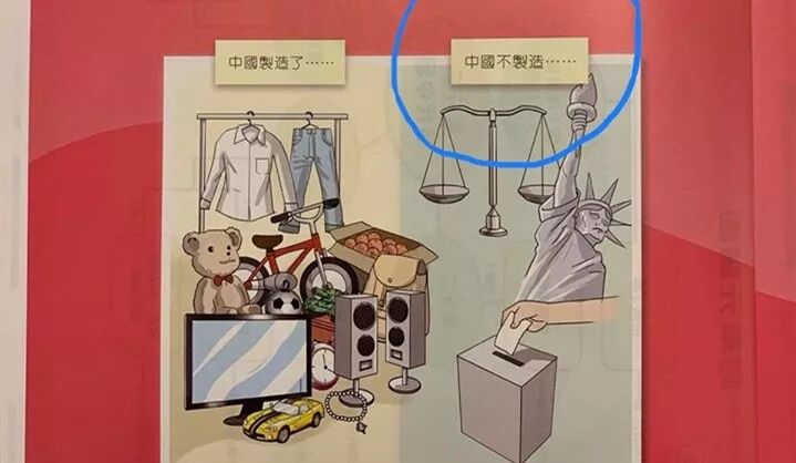 1、如下图,香港通识教材中直接用图示表示,中国生产了衣食住行玩的产品,中国不制造天平(代表公平)、自由女神(代表自由)、选票箱(代表民主)。