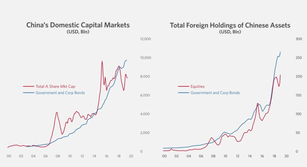 左图红线为A股市场的资本总额变化曲线,蓝色为政府和公司债市场总额变化。右图的红线为外资持有的中国资产总额,蓝色同为政府和公司债市场总额变化。