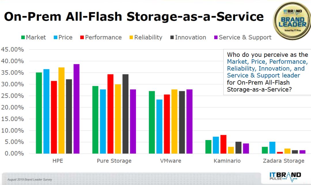 场内的全闪即服务,HPE(应该主要是Nimble)超过Pure Storage,拿下第一。VMware第三,感觉有点怪怪的。这里终于看到Kaminario的身影,可惜得票不是太高。