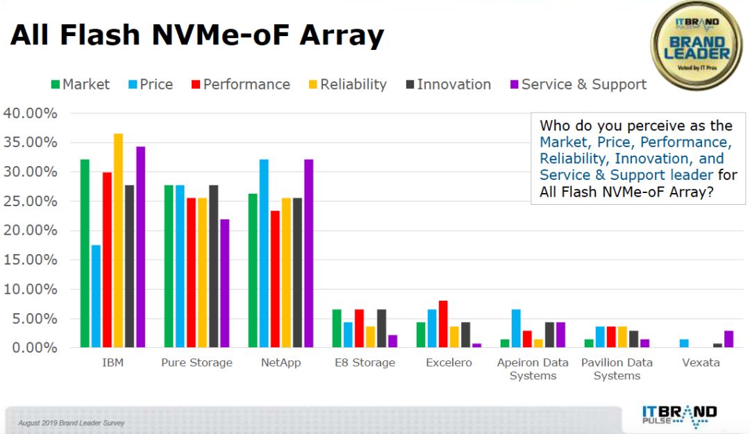 全闪的NVMe-oF,IBM居然超过Pure Storage,拿了第一,有点意外。这个市场变化比较快,其中E8 Storage刚刚被AWS收购,而Pavlion Data Systems刚刚融了一笔资。