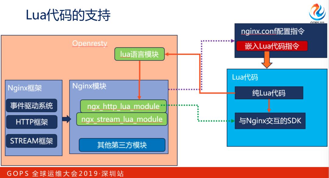 我们知道,Nginx框架由事件驱动系统、HTTP框架和STREAM框架组成。而Openresty中的ngx_http_lua_module和ngx_stream_lua_module模块给Lua语言提供了编程接口,Lua语言通过它们编译为C代码在Nginx中执行。