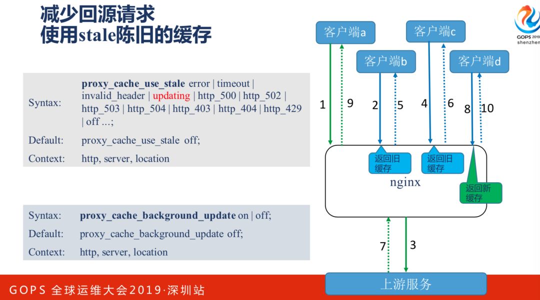减少回源请求是一个解决方案,但如果Nginx上有过期的响应,能不能先将就着发给用户?当然,同时也会通过条件请求去上游应用那里获取最新的缓存。我们经常提到的互联网柔性、分级服务的原理与此是相同的。既然最新内容暂时由于带宽、性能等因素不能提供,不如先提供过期的内容,当然前提是不对业务产生严重影响。