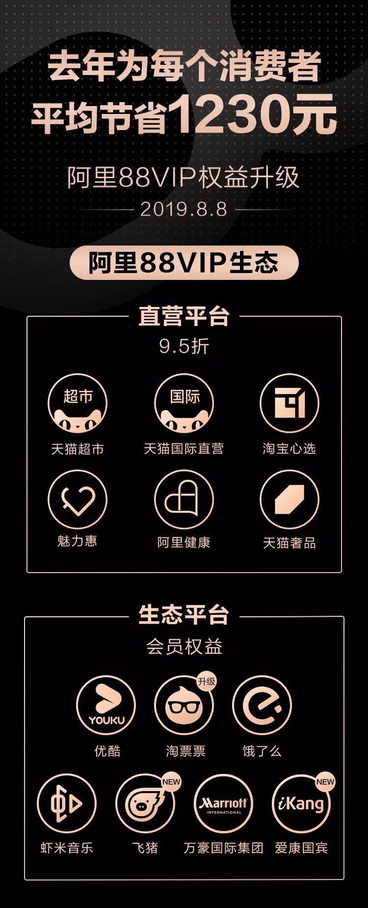 2018年8月8日,阿里在上海办了场演唱会,与其他演唱会不同,这场秀不卖票,只送。2019年8月8日,阿里再次次举办演唱会,还是不买票,只送票。今年演唱会,有萧敬腾、刘若英、薛之谦等明星,压轴出场的是当红的吴亦凡,得到演唱会定向邀请的,称为“阿里88VIP会员”,除了一年一度的演唱会,阿里还为这些“洋气”的会员提供包括优酷、虾米、淘票票等阿里体系的VIP会员服务,万豪旅享家会员卡、全球388个品牌商品的95折优惠。
