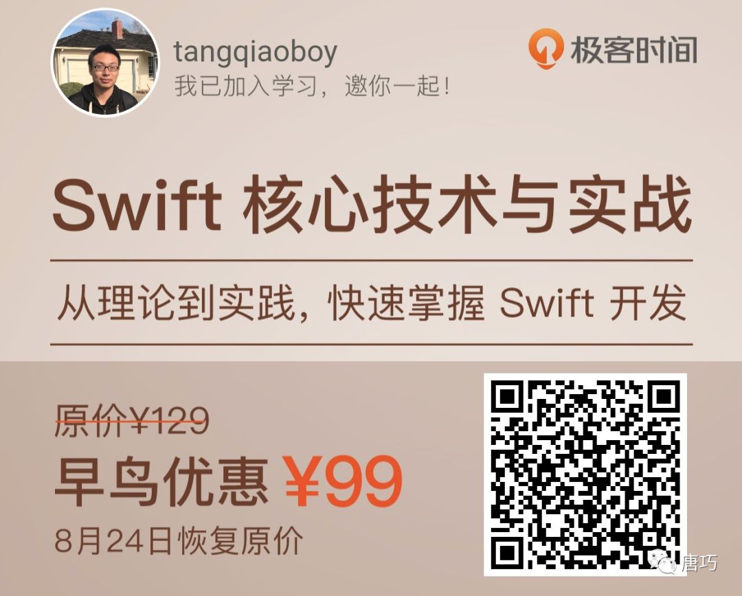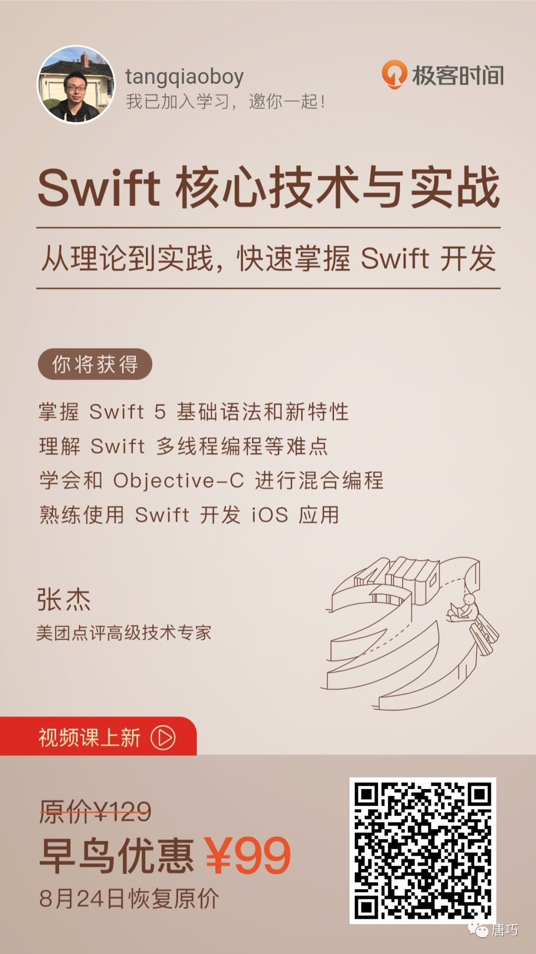 以上这几点,都给初学者带来了诸多不便之处。现在 Swift 的语言特性趋于稳定,最新版本 Swift 5 也很稳定了。如何解决呢?我推荐大家去学美团点评高级技术专家张杰在极客时间开设的视频课:《Swift 核心技术与实战》。