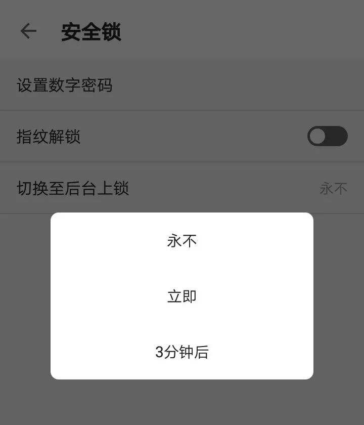 开发者还相当贴心地安排了设置切换至后台上锁的时间间隔的功能,有永不、立即、 3 分钟后这三档,当然了「永不」不是永远不锁,白设密码和指纹了,只是在你退出麻雀笔记的界面,运行其它软件时,只要你没有关闭它,它就处于不上锁的状态而已。