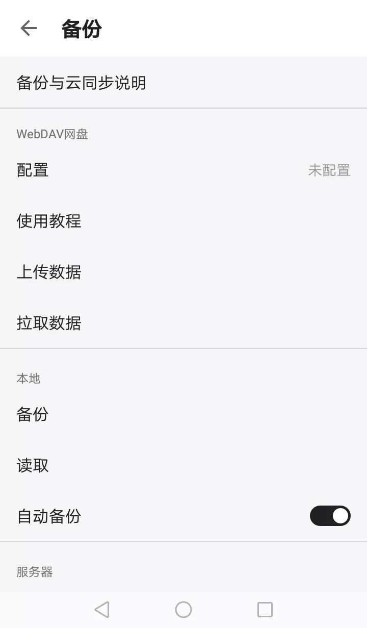 很多人也会担心自己的数据丢失或泄露,所以开发者在原来的版本上新增了备份的功能,备份包括本地备份和网盘备份,用户可以将自己的数据导出到本地或者上传到 WebDAV 网盘。