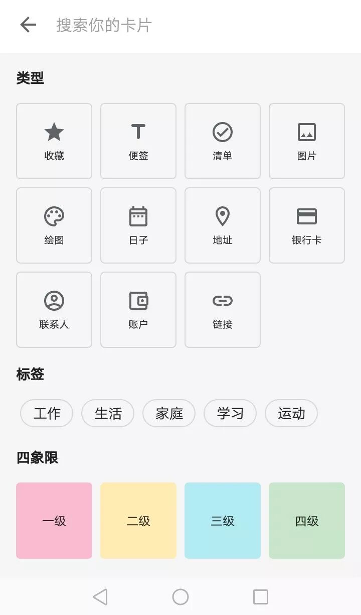 从类型、自定义标签、四象限(是指将事情分为重要且常用、重要到不常用、不重要但常用、不重要且不常用四个等级)三个维度对自己的笔记进行归纳整理,方便信息整理和搜查。