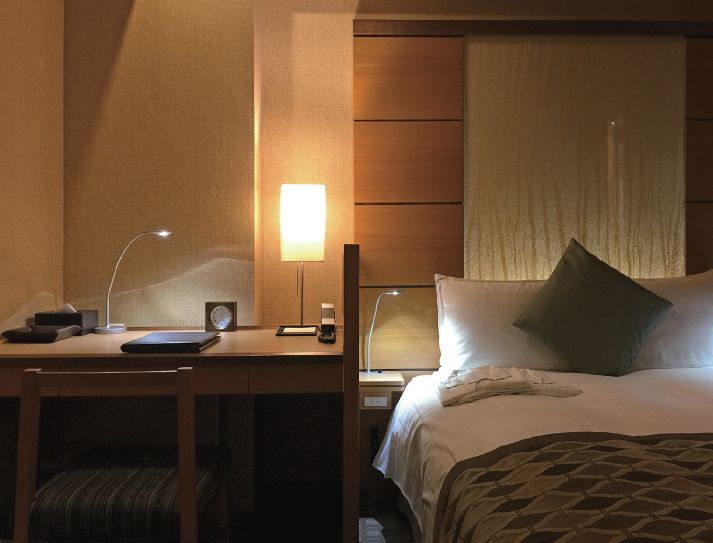 房内的家具以温暖的木质为主,地毯与床罩、抱枕则多采以多种「和柄」(日式的花纹图案)与江户传统色(深川鼠、芥子色、瓮)配搭,床板灯透过和纸,窗外光线又穿过和纸木窗,形成柔和与令人舒缓的气氛,还有日本老牌名床「NIHON BED」加持,与床上摆放的没被浆过、质地柔软的睡衣静候好眠; 卫浴间里还提供日本品牌POLA 的沐浴备品,以及来自日本百选的富山县入善町名水,连毛巾也是吸水性强的超长棉。尽管房内空间不大,但每个细腻的环节造就了房内雅致的疗愈氛围。