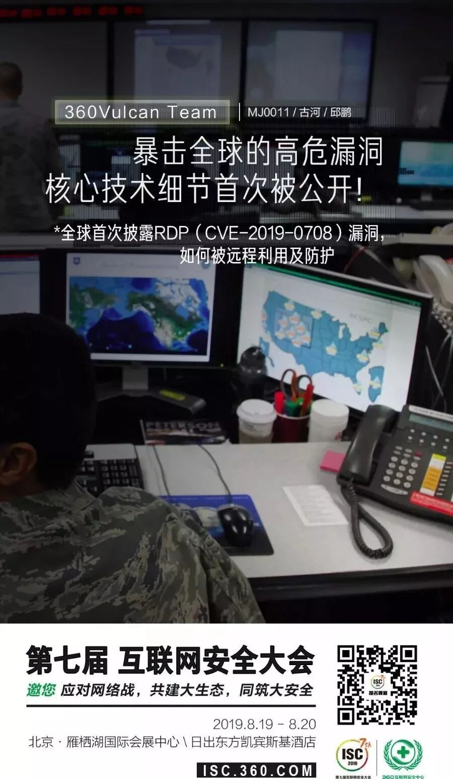 这次BlackHat“全球黑帽大会”,360 Vulcan Team交上了漂亮的答卷。在接下来的ISC 2019第七届互联网安全大会上,他们将从幕后走到台前,向众人揭秘未被他人所知的RDP漏洞。