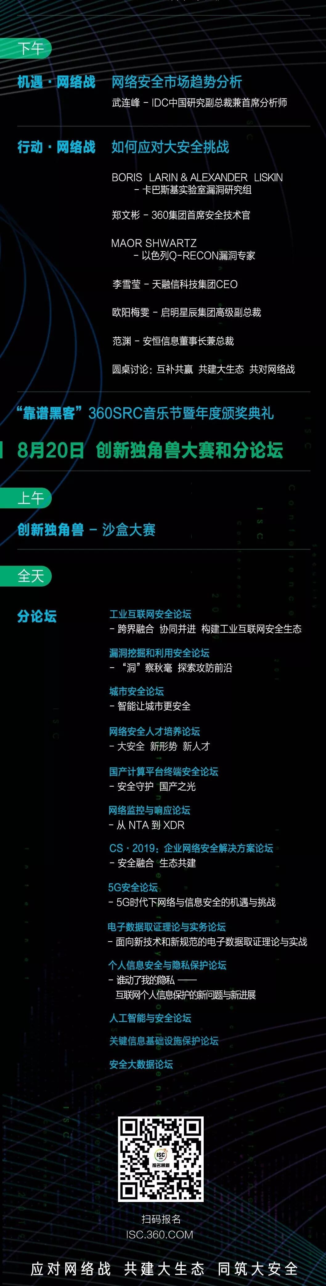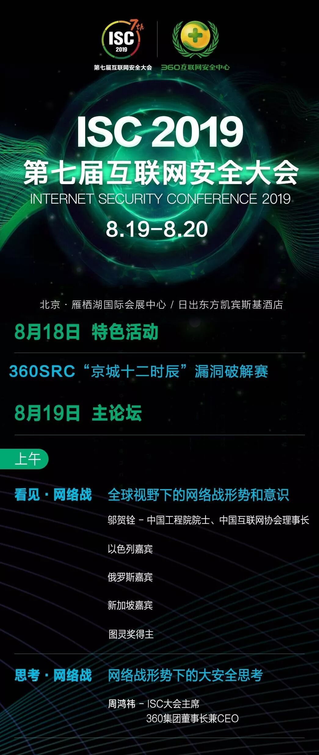 ISC 2019的主题是“应对网络战,共建大生态,同筑大安全”。包括中国工程院院士、中国互联网协会理事长邬贺铨、2015年图灵奖得主惠特菲尔德·迪菲、重量级漏洞军火公司创始人马奥尔·施瓦茨等在内的10位以上院士级专家,400余位演讲嘉宾、超120家参展机构、500家海内外主流媒体将共赴大会。