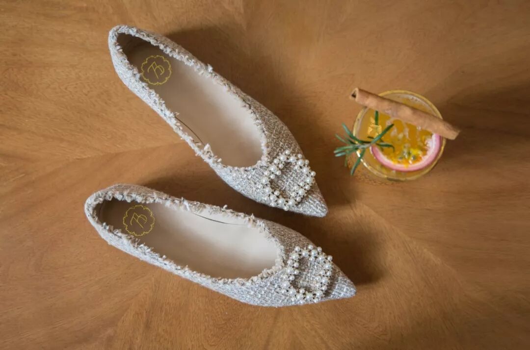 ▲平底鞋据说也是设计上改用了更厚的海绵内包,尖头和v型鞋口的剪裁设计也不失干练,这双粗花呢的材质本来按理来说适合秋天,但这款编织的米色鞋真是超级百搭,夏天配白色阔腿裤,简直一流,就算穿正装也不失礼,因为前缀有亮晶晶的珍珠方框,非常有女人味得来又优雅。
