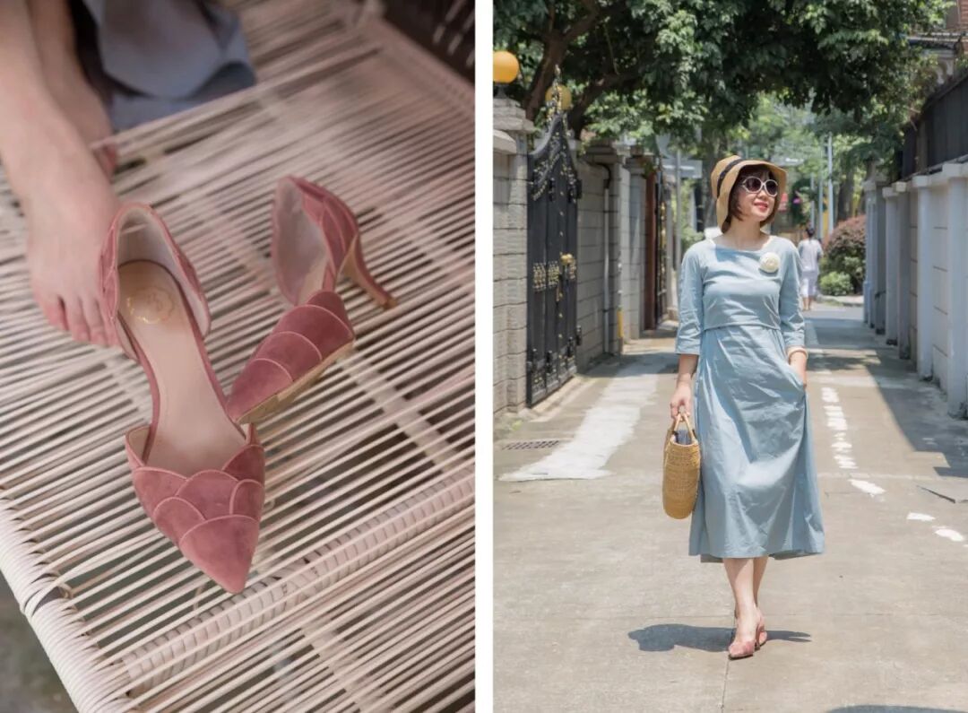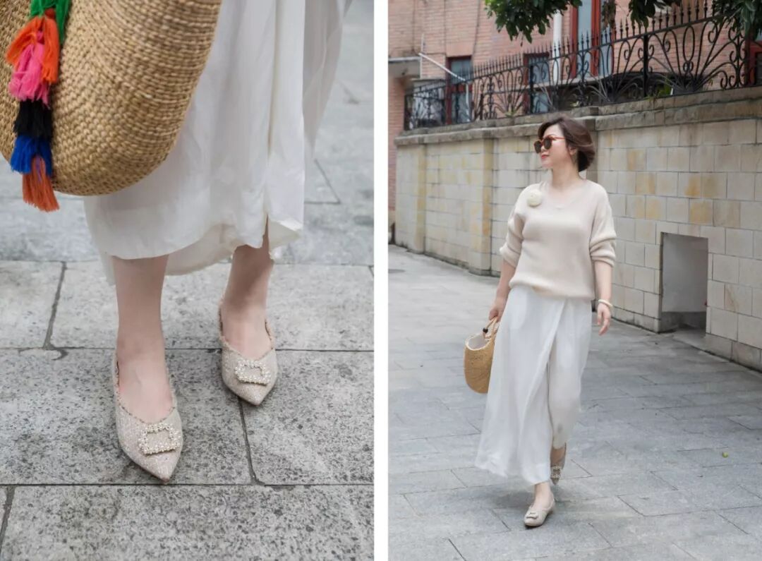 选的鞋子都是大方显腿长的设计,又因为不再追求小姑娘式的甜美,所以在选鞋子上,要注重颜色的柔和以及细节上的柔美,而不是小孩子喜欢的那种怪诞和幼稚的设计。