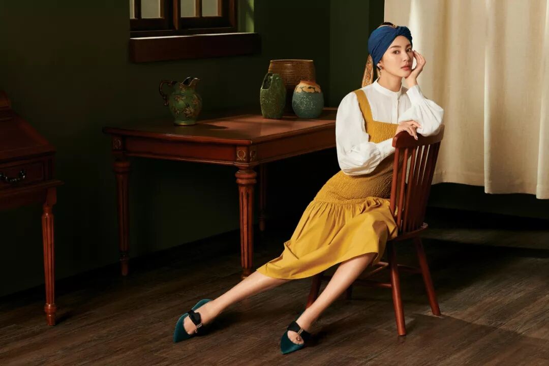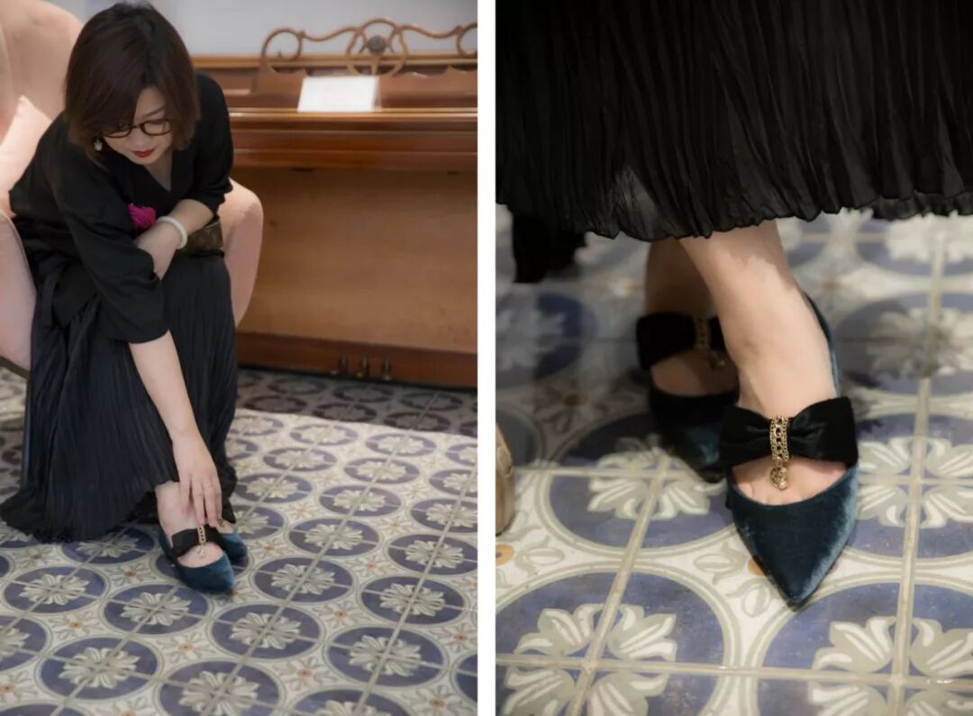 ▲这双是张小姐坐在画框里脚上那双雾霾蓝尖头鞋,有点玛丽珍鞋的意思,蝴蝶结的扣饰和尖头的优雅设计,又更摩登,优化了身材的比例,蓝小姐超级喜欢,那种颜色很高级,上脚很显脚白,搭配深色浅色都好看。