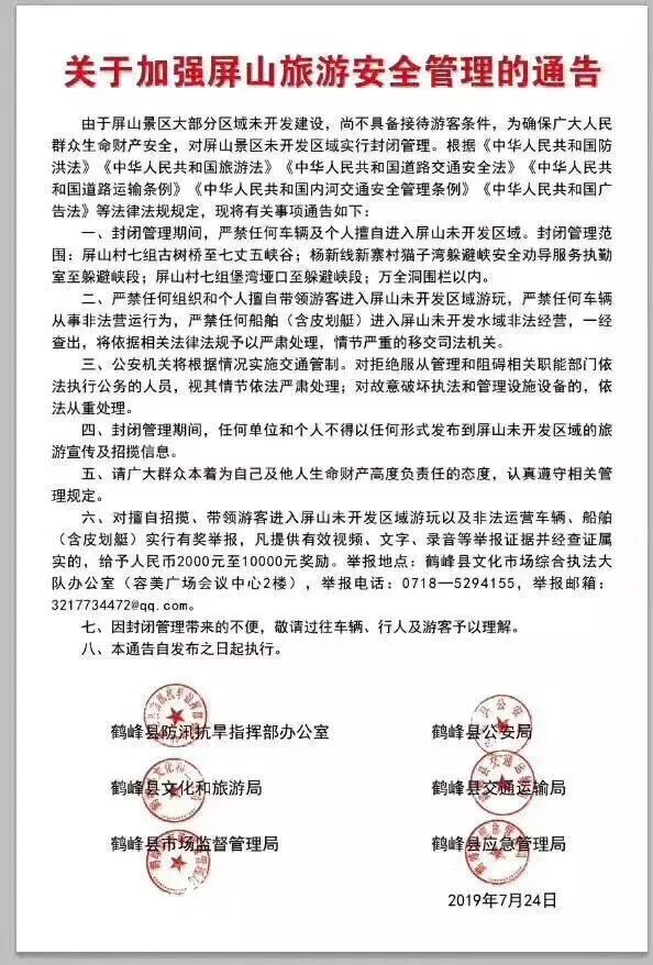 今年7月24日,鹤峰县六个部门联合发布《关于加强屏山旅游安全管理的通告》,通告称,由于屏山景区大部分区域未开发建设,尚不具备接待游客条件,对屏山景区未开发区域实行封闭管理,严禁任何车辆及个人擅自进入屏山未开发区域。而躲避峡就封闭管理范围之内。