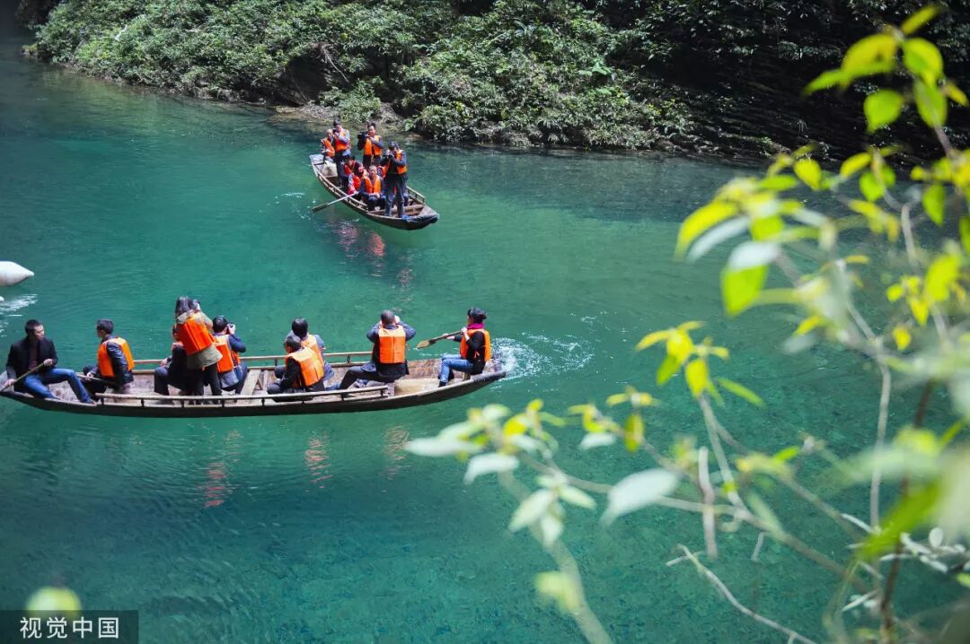 2015年4月11日,游客在湖北鹤峰县屏山躲避峡谷坐船游览,清澈见底的河上,船如浮空中。
