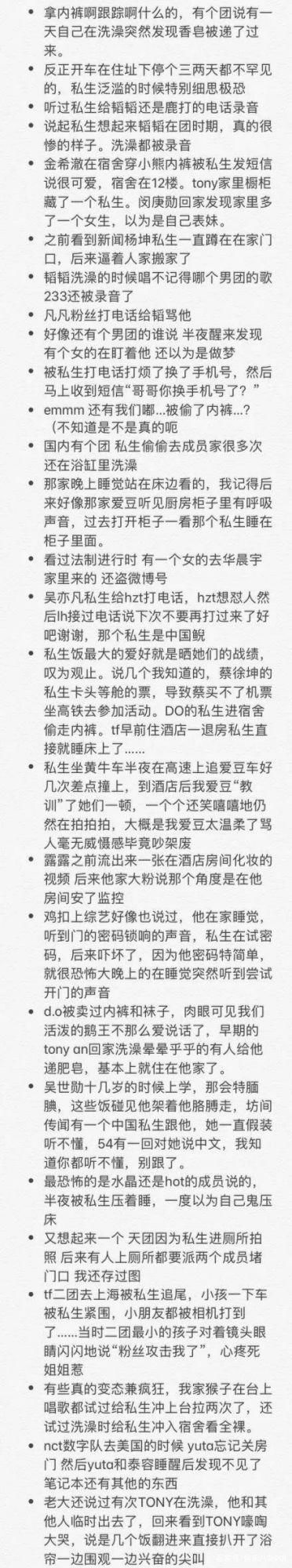 这些私生饭,除了购买一些明星信息之外,还会为了满足自己的私欲,从而跟踪、偷窥、跟拍工作期间的私人休闲、酒店蹲守、跟机拍摄、包车尾随,偷拍明星的日常以及未公开的行程和工作,骚扰自己喜欢的明星,影响艺人包括其家人的私生活。