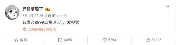 “乔碧萝殿下”为自己红遍全互联网和“出圈”奋力一搏。斗鱼是出名和粉丝的主阵地,可她还在微博上涨粉。她每一条微博都带话题#乔碧萝殿下#,还@蔡徐坤和@蔡徐坤粉丝团官微,写道:“不知道能不能蹭热度。”电影《哪吒》渐热之后,她微博上除了话题#乔碧萝殿下#之外,还加了一条#哪吒票房破5亿#,增加网友能搜索到她的可能性。“乔碧萝殿下”不断鼓励网友关注微博和跟她互动,8月1日晚上,她发微博:“转发过9999点赞过5万,发视频。”这些动作很有效果,7月31日时,她微博粉丝是5.7万,到了8月2日就超过了10万,截至发稿,粉丝量一直在涨。