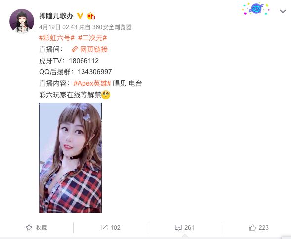 卿瞳在虎牙上的账号则是“涉嫌违规,正在整改中”。她在4月19日发的微博中,自称是“彩六玩家在线等解禁”。这句话翻译一下是说,她玩了禁播的游戏《彩虹六号》被封号了。“《彩虹六号》因为血腥,不许在公共平台直播。她这么做,要不然就是太想红,要不然就是她不知道,没人、没团队告诉她。平台现在监管很严格,也很敏锐,成熟的主播不会挑战这个。”小叙说,“她也有聪明的地方,这个游戏可能只有直男玩,精准吸引她的目标粉丝群体。”