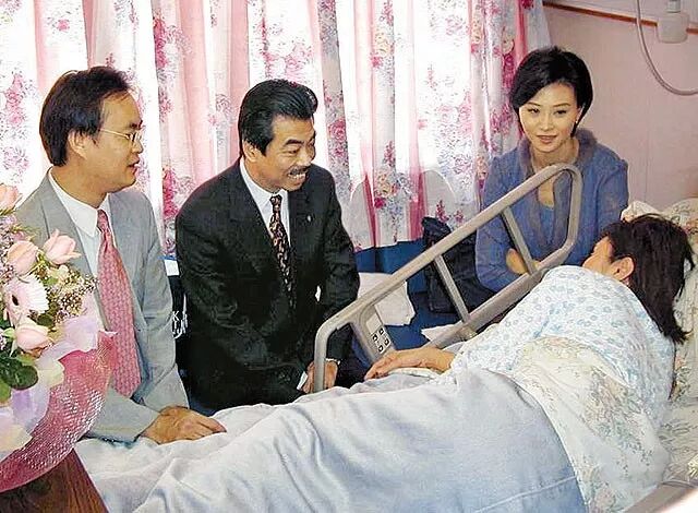 ▲亚视高层黎文卓(左)及封小平(左二)以及亚视新晋一姐朱慧珊到医院看望林建明。