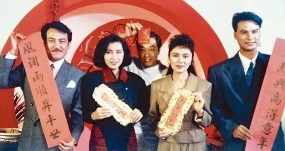 ▲任达华、林建明、曾江、陈秀珠与刘丹跟观众拜年,任达华那时多年轻啊。