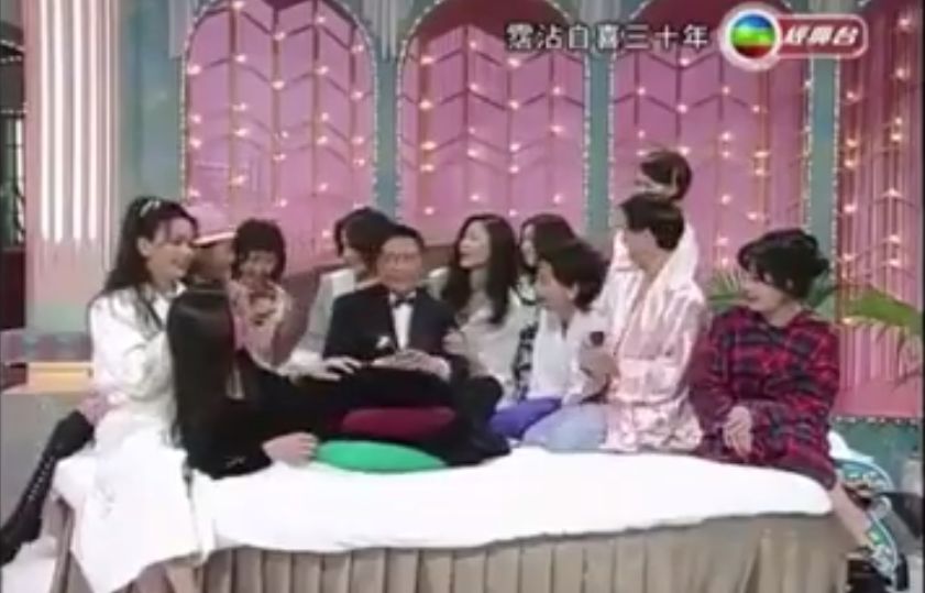 其他美女都是谁呢?关之琳、蓝洁瑛、周慧敏、刘美君、江欣燕、曾华倩、李美凤,还有客串来的白韵琴……躺在大床上主持节目,可不是从蔡康永和小S那里来的,是从黄老霑那里来的,这也是他最爱的一个场面……