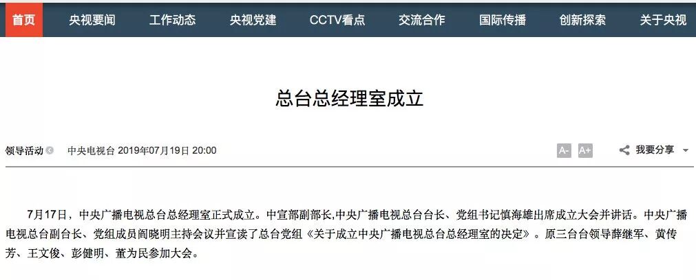 - 中央广播电视总台机构改革提速!