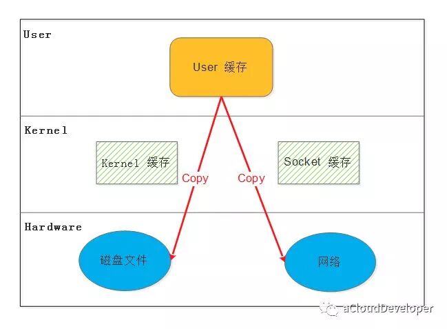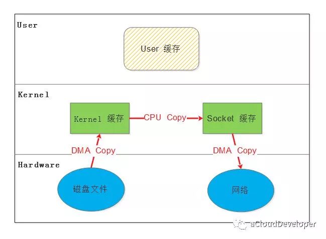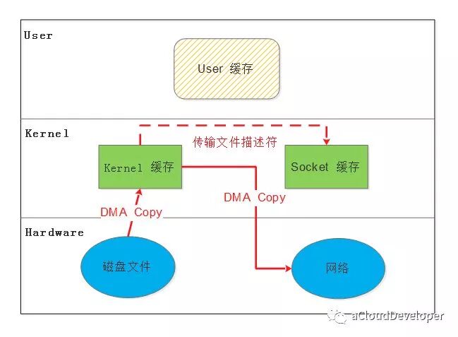 write(sockfd, buf , n);那么整个过程就需要经历:1)read 将数据从磁盘文件通过 DMA 等方式拷贝到内核开辟的缓冲区;2)数据从内核缓冲区复制到用户态缓冲区;3)write 将数据从用户态缓冲区复制到内核协议栈开辟的 socket 缓冲区;4)数据从 socket 缓冲区通过 DMA 拷贝到网卡上发出去。