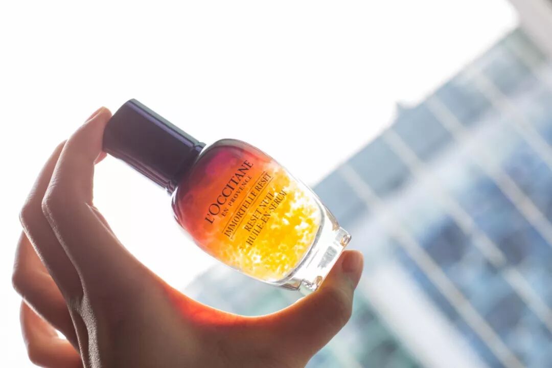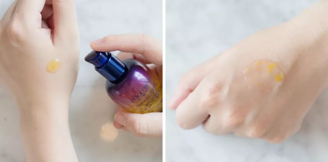 最引人注意的一颗颗黄色的颗粒,包裹着星光瓶的灵魂成分——黄金腊菊微囊精华油。金光闪闪的腊菊精油不仅看上去很贵,实际上也是非常稀有,因为大约1500万朵腊菊只能提炼出1千克腊菊精华油,产出低得非常惊人。而且欧舒丹选取了不是我们常见的普通腊菊,而是被法国当地人称为“黄金不凋花”的科西嘉岛腊菊。在全球500多种腊菊中,只有它能够能够提炼出高活性的乙酸橙花酯,能抵抗自由基,有着抗初老的功效。在花期内手工采摘最新鲜的腊菊,配合的欧舒丹的微囊技术很好地封存住它的珍贵活性成分。细细打量瓶中的质地,就能看到实实在在的3000颗黄金腊菊微囊悬浮于精华液之中,这是一种跨越时间和距离、肉眼可见的新鲜。而底层透明的精华液也不简单,包含了"植物界肉毒杆菌"的千日菊精华液唤醒肌肤自身活力,"植物界的胶原蛋白"马郁兰精华液能让肌肤柔润有弹性,三种植物精萃共同协作发挥出抗氧、修复、焕亮的效果。▲挤出来的精华会带着一颗颗的黄色小颗粒,稍稍按摩它就会被揉开和精油液融合在一起,化成轻盈的蜜露质地。