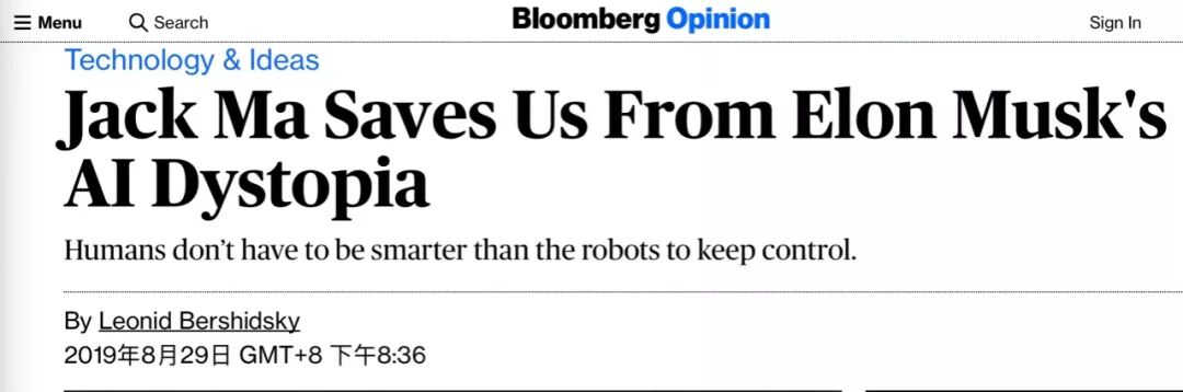 《Bloomberg Opinion彭博评论》这篇评论的标题是,“Jack Ma Saves Us From Elon Musk’s AI Dystopia”,翻译过来就是,“马云解救我们于埃隆·马斯克的AI反乌托邦”。