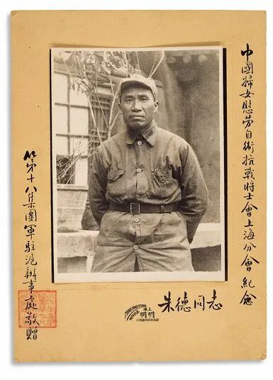 中国妇女慰劳自卫抗战将士上海分会,是第二次国共合作时期上海妇女抗日统一战线组织,该会成立后,一直与八路军驻沪办事处保持密切联系,竭尽全力为抗战第一线的战士服务。这张朱德同志的照片是第十八集团军驻沪办事处赠给中国妇女慰劳自卫抗战将士会上海分会主席何香凝作为纪念的,何香凝一直将这张照片珍藏在身边。1959年何香凝在北京将这张照片捐献,现为馆藏国家一级文物。