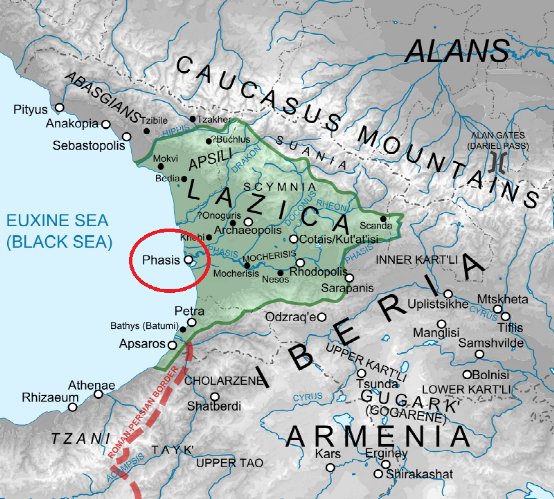与此同时,萨珊国王库思老一世也对高加索战局更为重视。他不仅继续从伊朗高原派出新军,还动员靠近拉奇卡的伊比利亚人和阿尔巴尼亚人给他们提供更多辅助部队。从将直接参与拉奇卡战争的士兵人数增加到60000以上,并计划对位于山区南部的法尔萨斯城实施猛攻。作为曾经的古希腊殖民城市,法尔萨斯一直是链接小亚细亚半岛和高加索山区的交通节点。加之毗邻黑海和拥有同名的河流经过,又衍生为大海与内陆高山间的必经之路。正因如此,当地长期部署有一定数量的罗马士兵,却又自恃有天然条件赋予的三面安全而忽略城墙建设。在拉奇卡战争的最后阶段,这里已集中了20000名来自五湖四海的拜占庭军人。倘若他们被波斯人歼灭,或是法尔萨斯遭萨珊军队占领,都将意味着高加索山区同帝国关系的彻底决裂。指挥萨珊军队的纳乔拉根,也正是看到了这点,才决心要不惜一切代价的予以占领。