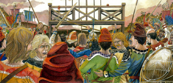 面对三倍于自己的围城大军,马丁也只能将全部人力都分散到各头驻防。在最易遭受强攻的南面,他同时部署了来自北非的摩尔盾矛兵、小亚细亚山区的伊苏利亚标枪手和高加索本地雇佣兵分队。他们所具备的共同特征,就是都保留着自己原有的蛮族生活作风。因而在作战中能坚持更长时间,不会轻易因恐惧和挫败感而放弃抵抗希望。与之情况类似的部队,是负责东南面防务的赫卢利-伦巴第步兵。他们都是非常典型的规划日耳曼士兵,有着远胜其他同僚的冲锋能力。少数随军东征的匈人后裔,被安排去把守渡口的船只。至于规模不在少数的其他希腊人分队,则位于压力相对较小的其他段落。由于自知无法立即强取得手,萨珊军队每日都会派大量弓箭手在城下进行骚扰挑衅。马丁则严令属下不得擅自外出追击,以免落入波斯军队的预设陷阱。然而,位于南面城墙的摩尔与伊苏利亚蛮族,却不堪忍受天天被嘲讽的屈辱。最后以辱骂将领是懦夫的方式,才获准派200人的小分队实施反击。这个举动也完全出乎城外的波斯士兵预料,向来以善战著称的德拉米步兵,也为避免正面接触而向后撤退,任由为罗马效力的蛮族在阵地中来去自如。站在高处观摩的马丁,也因这个小小风波而受到极大启示。
