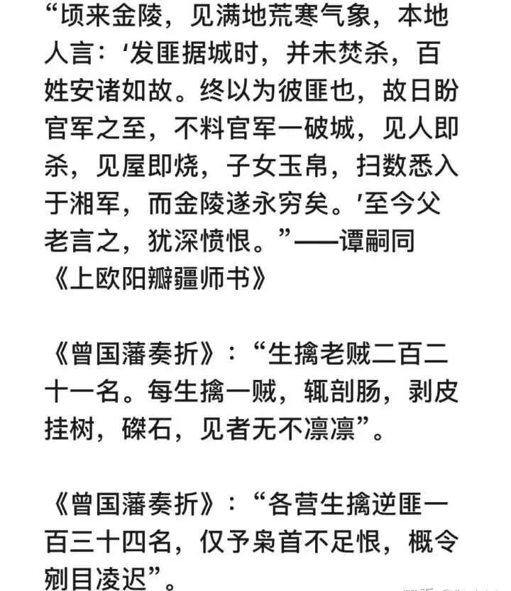 “男子髫龄以上皆死,各伪官眷属妇女自尽者数十人,余妇女万余俱为兵掠出。房屋贼俱未毁,金银衣物之富,不可胜计,兵士有一人得金七百两者。城中凡可取之物,扫地而尽,不可取之物皆毁之。”——赵烈文《能静居日记》记曾国藩天京屠城