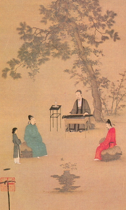 ▲传为宋徽宗手绘的《听琴图》,中间弹琴者为宋徽宗。