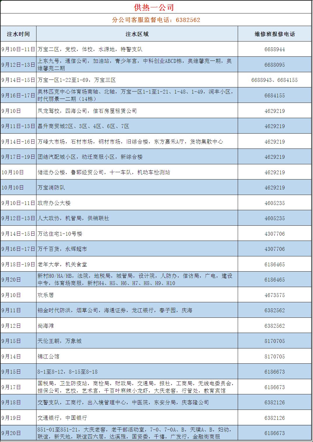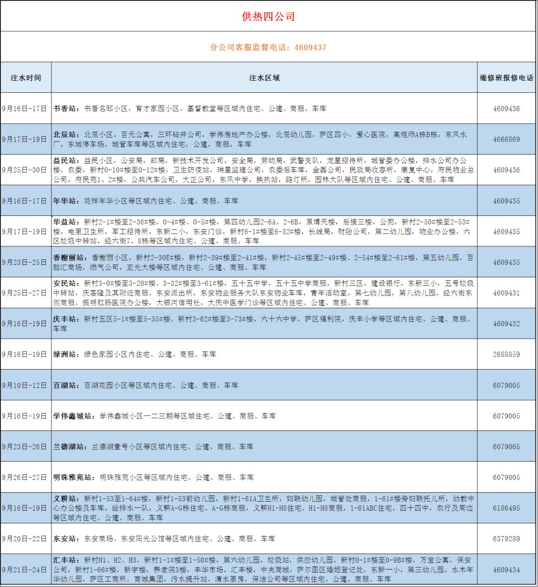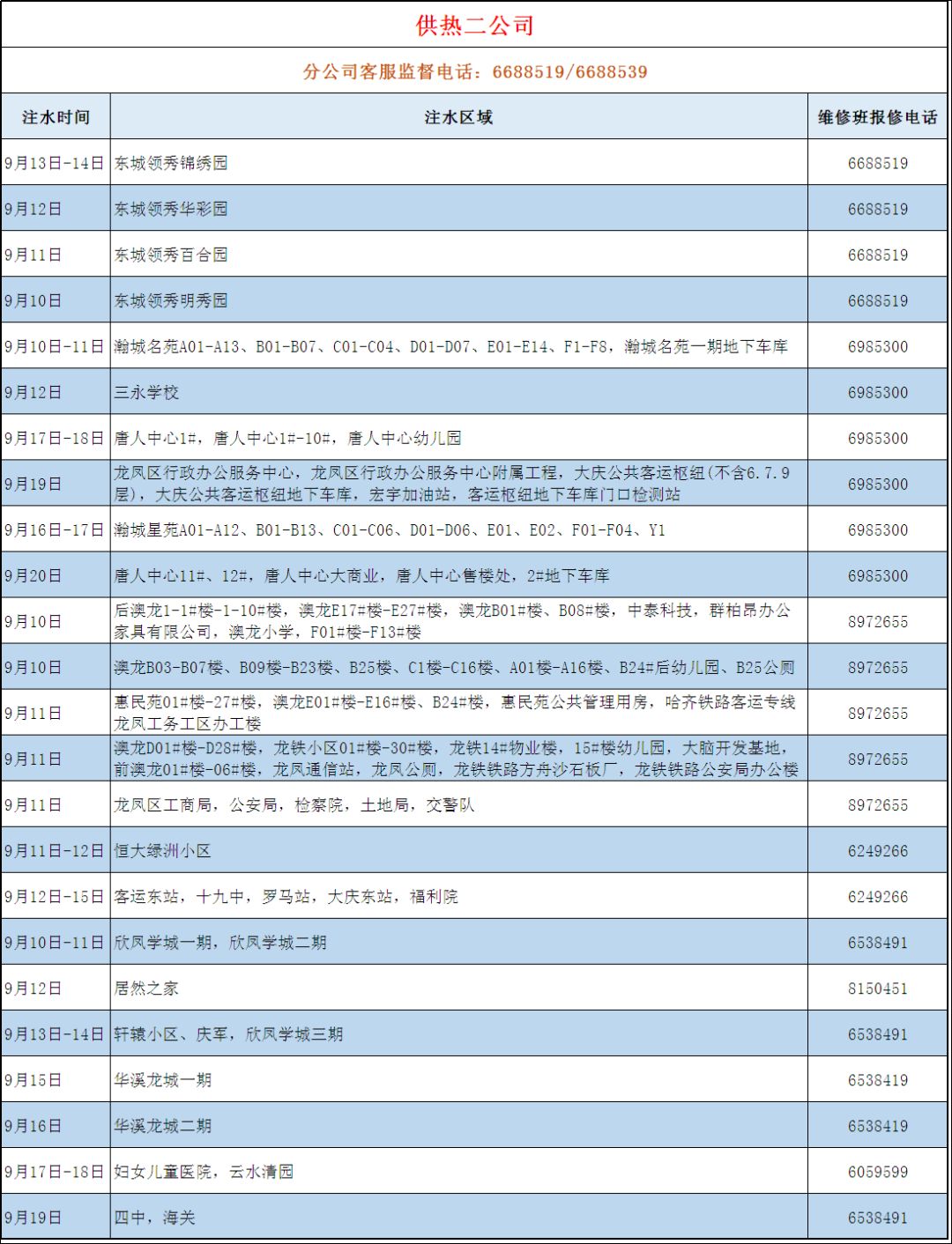 - 注意: 供热管网系统 于2019年9月10日开始陆续注水 记者从大庆市热力集团有限公司获悉,供热管网系统于9月10日开始陆续注水(高新热力辖区部分小区已提前注水),同时进入冷水运行,预计到10月10