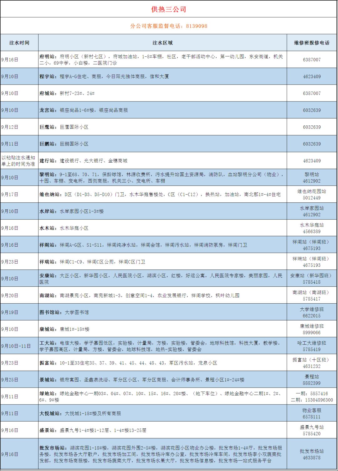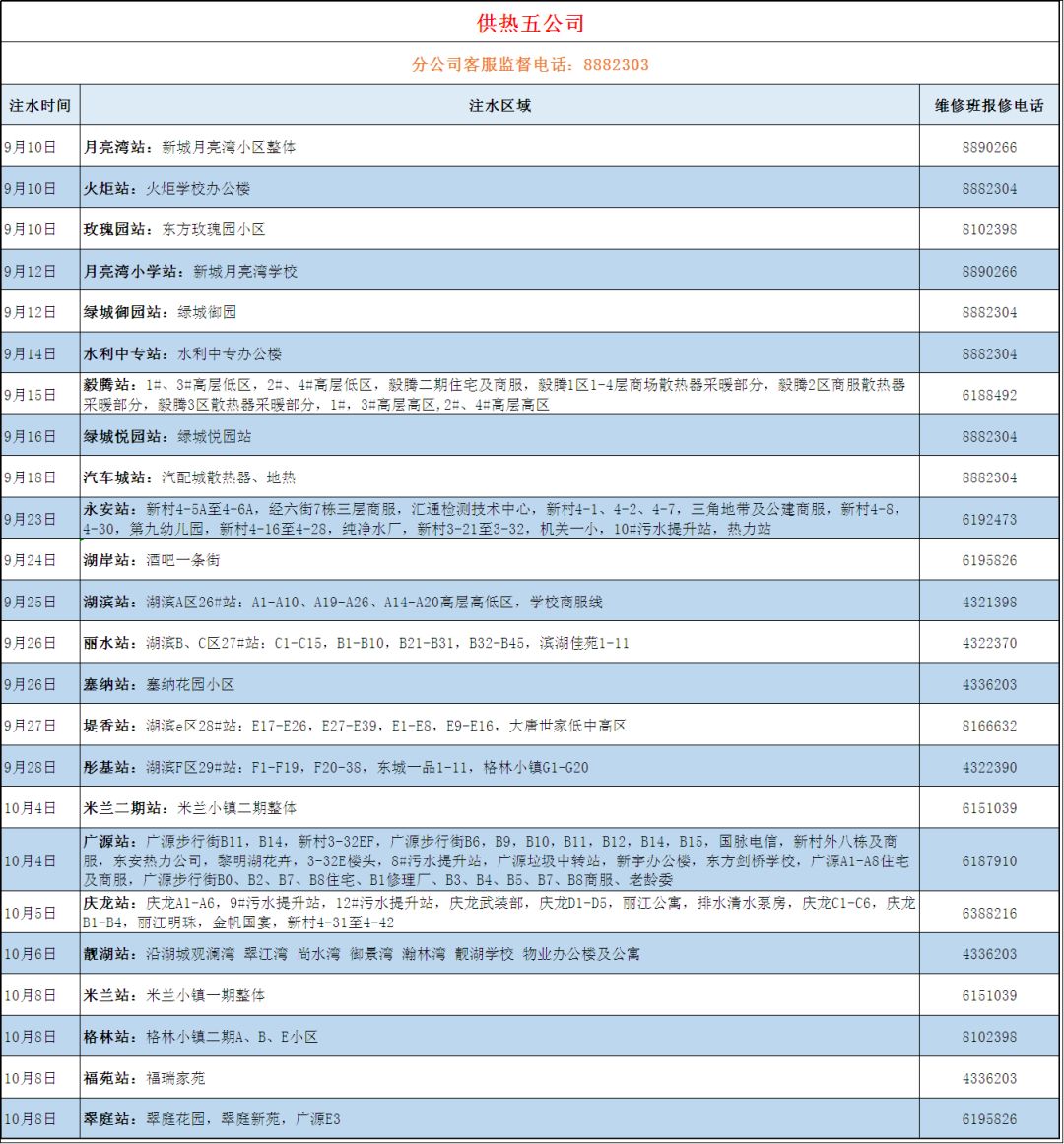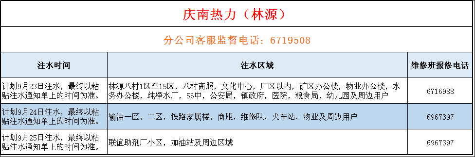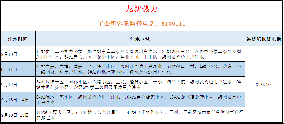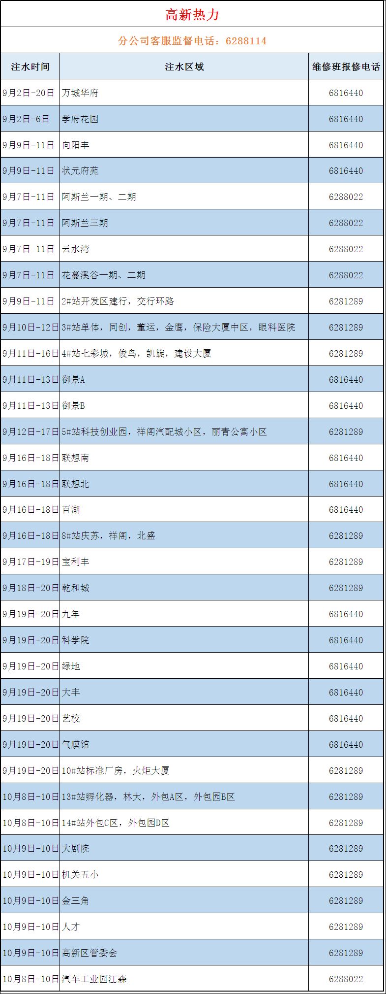 - 注意: 供热管网系统 于2019年9月10日开始陆续注水 记者从大庆市热力集团有限公司获悉,供热管网系统于9月10日开始陆续注水(高新热力辖区部分小区已提前注水),同时进入冷水运行,预计到10月10