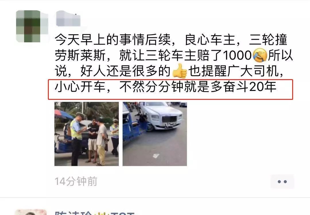 - 惊了!东莞三轮车撞凹500万劳斯莱斯!最后赔了.....