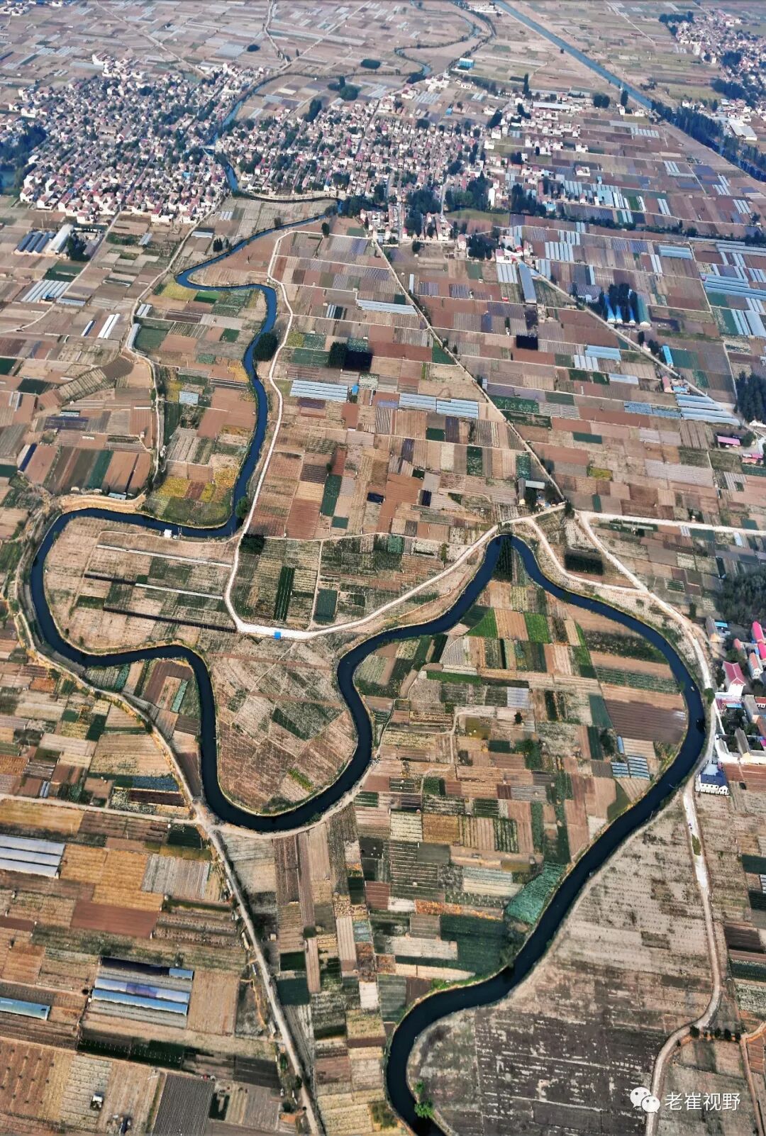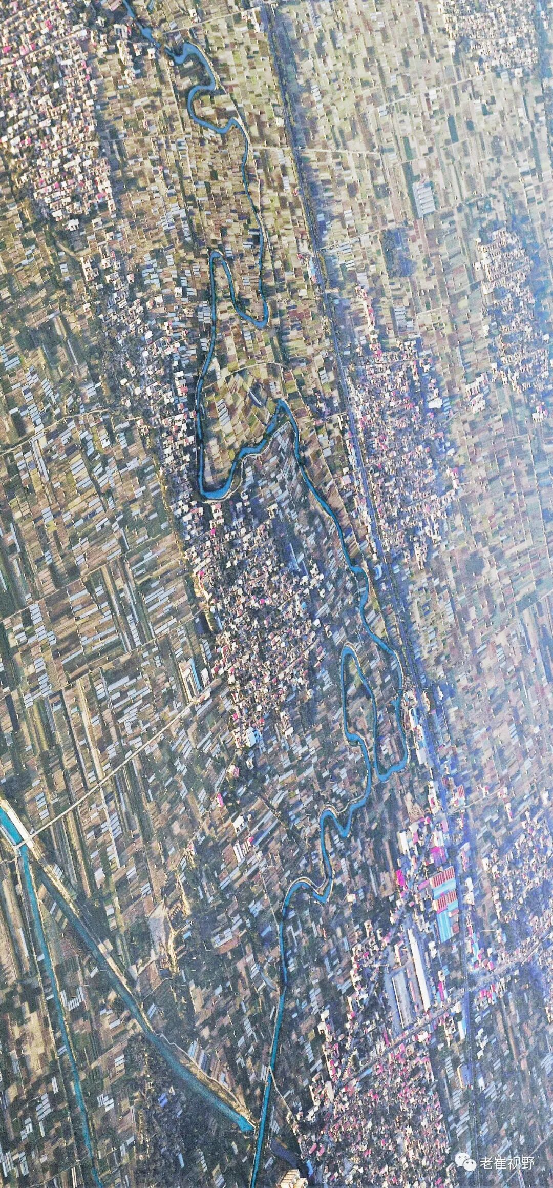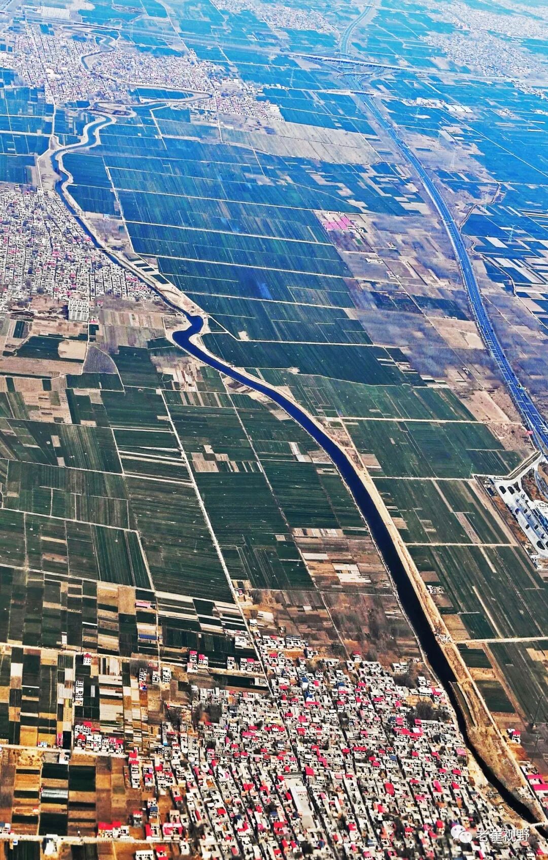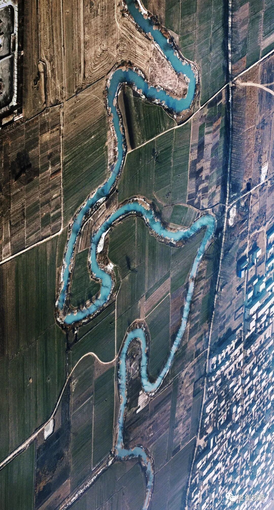 (图片上部的村庄是石桥村,滏阳河从这里向北,开始了任性的摇摆,在大地上刻出了迷人的曲线。图片水流走向:下。摄影@邯郸老崔)