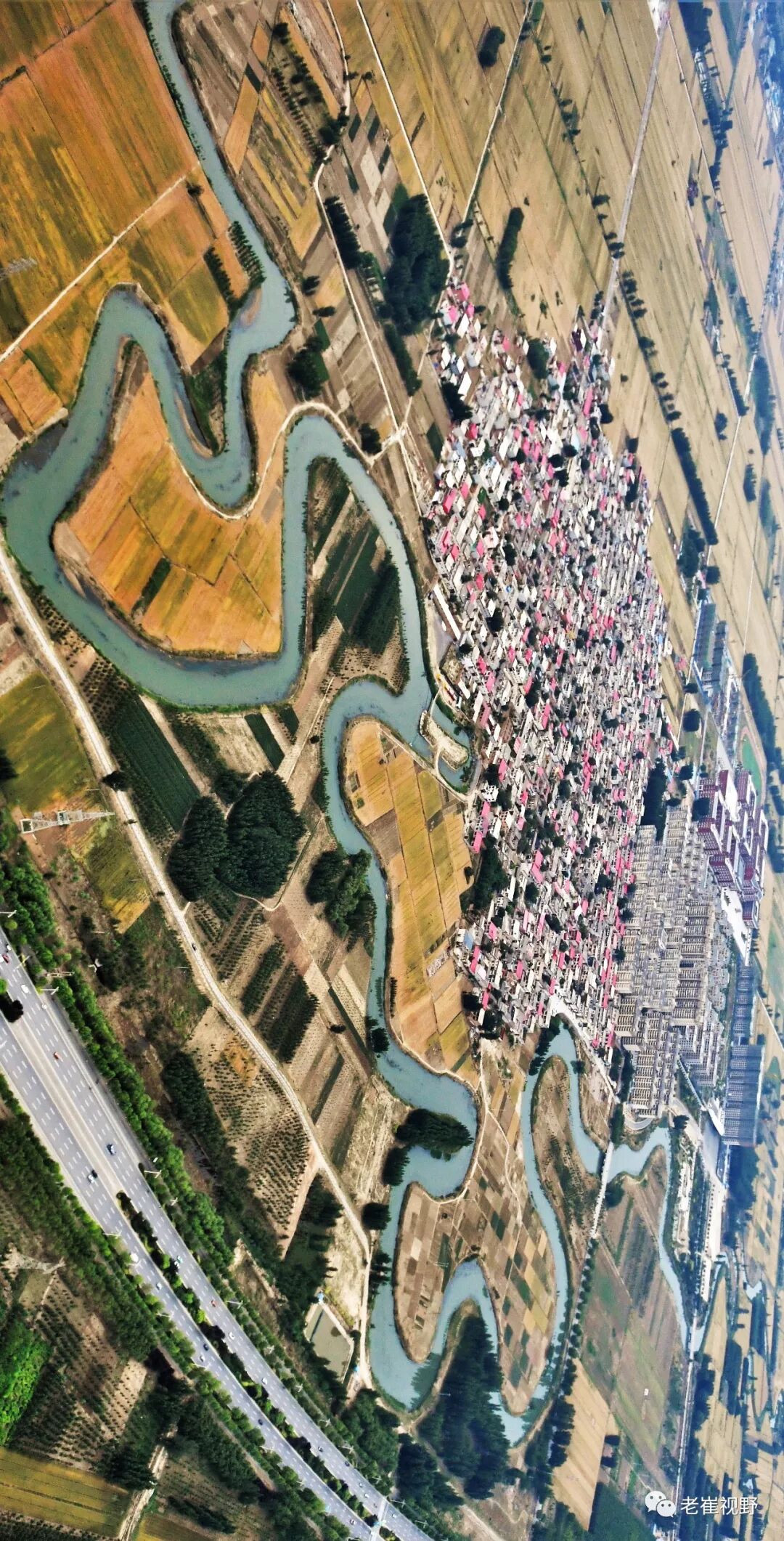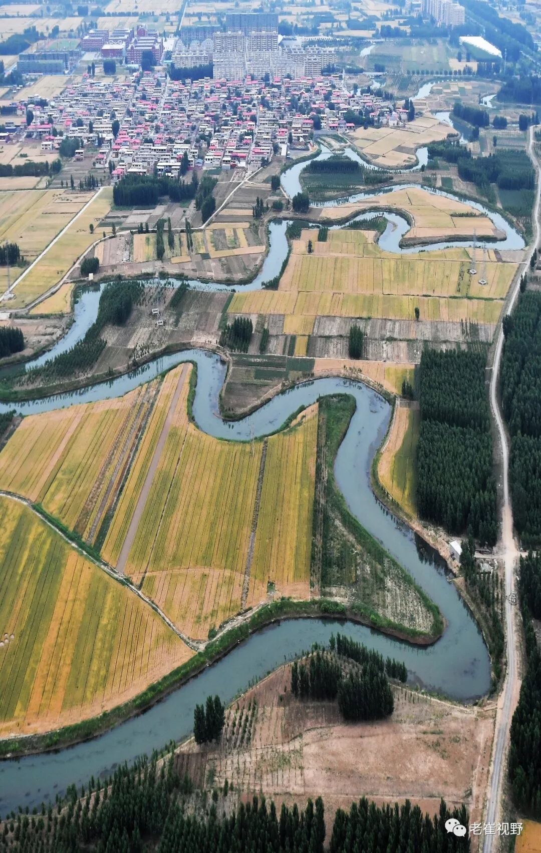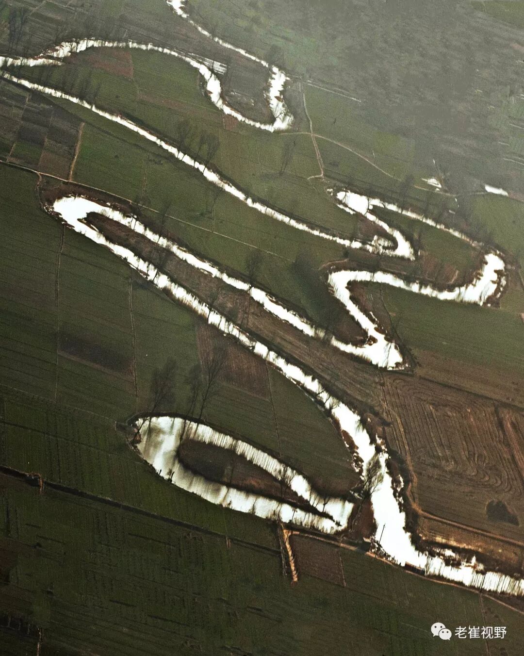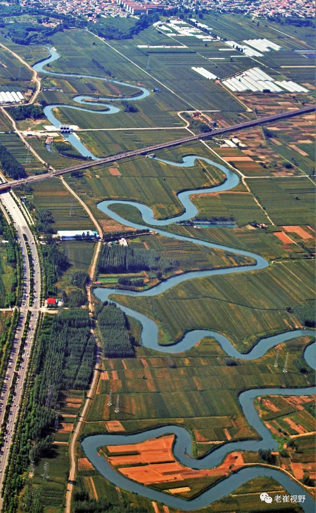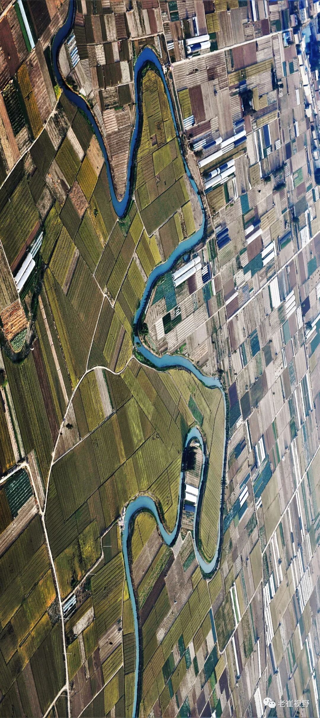 (图片上部的村庄是石桥村,滏阳河从这里向北,开始了任性的摇摆,在大地上刻出了迷人的曲线。图片水流走向:下。摄影@邯郸老崔)