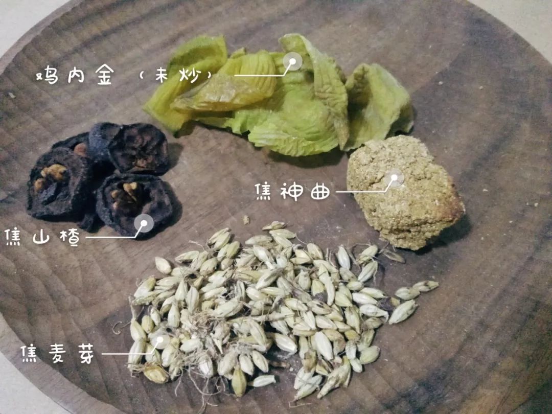 配料:焦山楂 6g 、焦麦芽 6g 、焦神曲 6g 、炒鸡内金6g