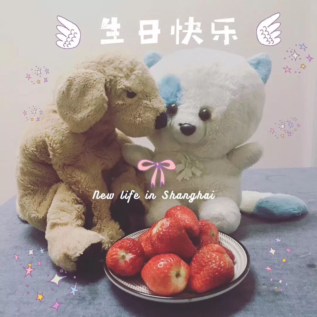 我的新室友竟然毫不费力地 get 到了这件事的重要性。虽然天色已晚,没有地方买蛋糕蜡烛,可是她还是为熊宝贝摆上草莓庆生,并且贡献了自己的玩具狗汪出镜,为熊宝贝拍了美美的生日照。