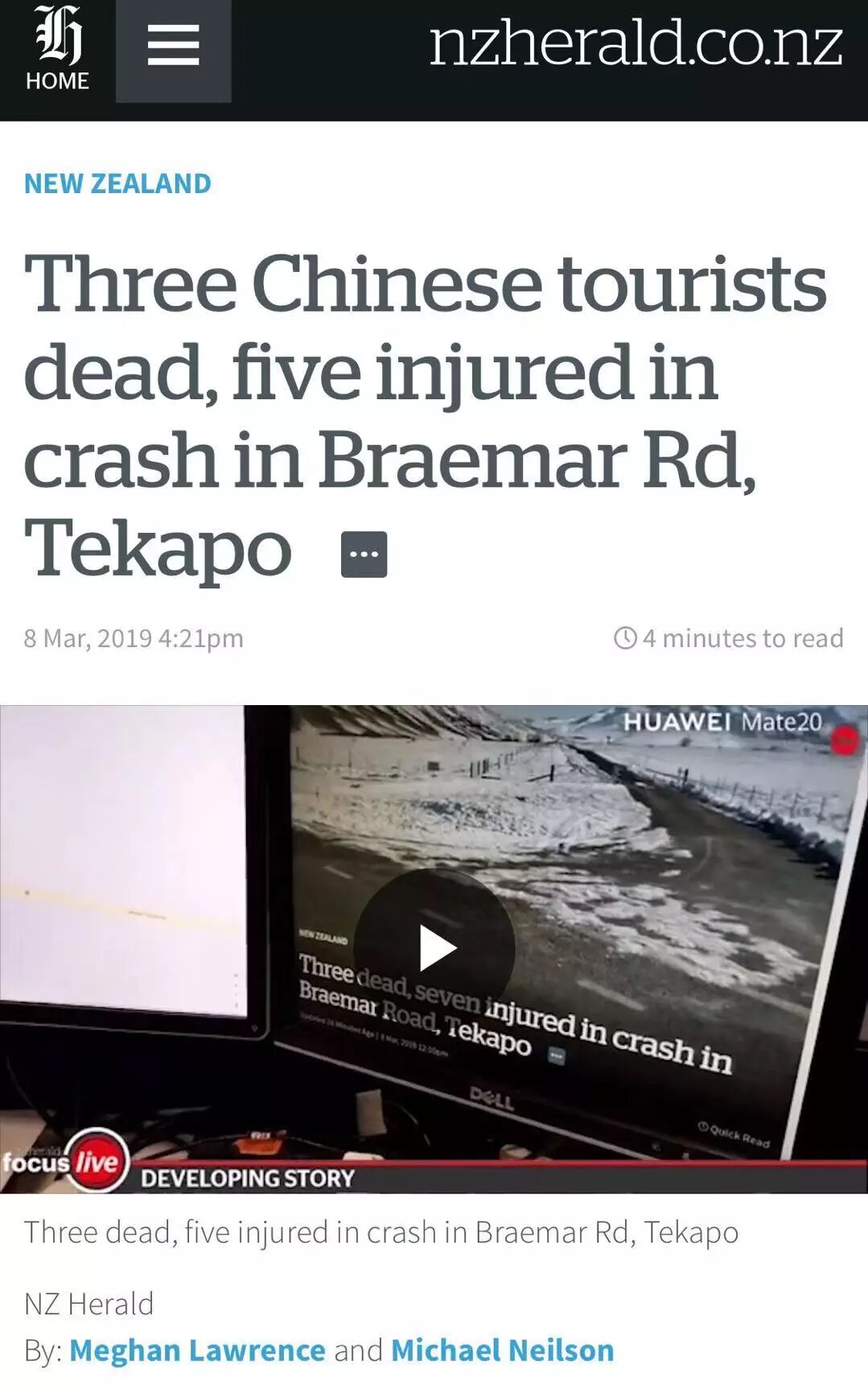 (NZ Herald:新西兰Tekapo发生严重车祸,造成三名中国游客死亡,五人受伤)