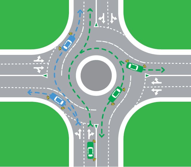 在环岛中左转车辆需靠左道行驶,右转车辆需靠右道行驶,