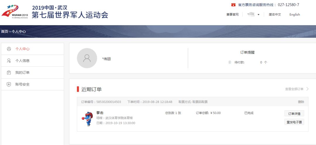 已在武汉军运会官方票务网站上